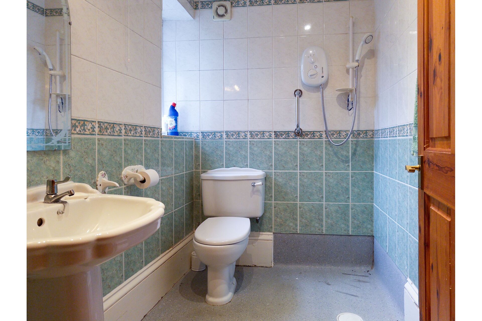 Including a pedestal wash basin and a close coupled toilet, a wet room shower area with full tiling to the walls.