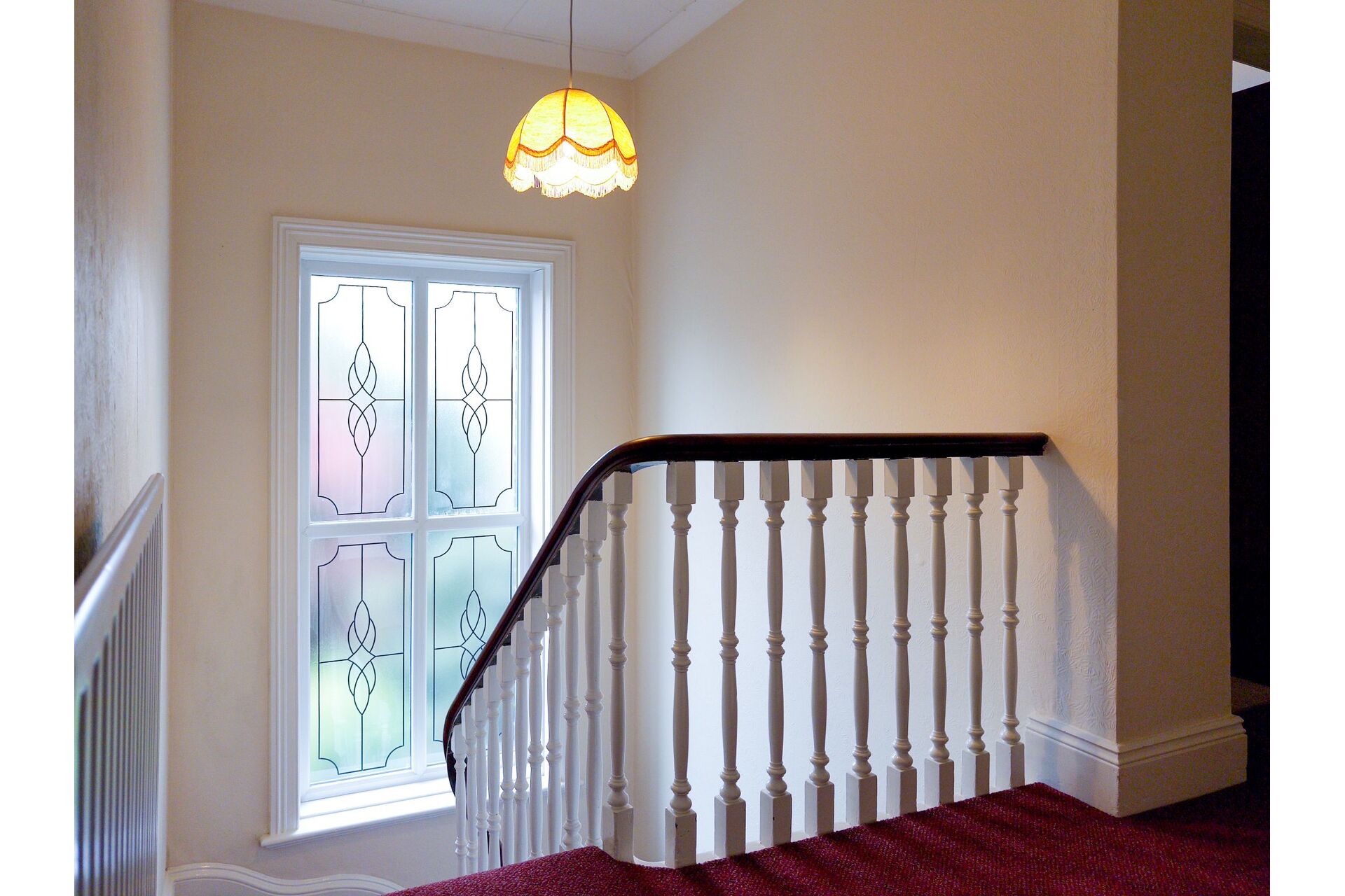 A spacious landing with a spindle banister and a tall window to the half landing.