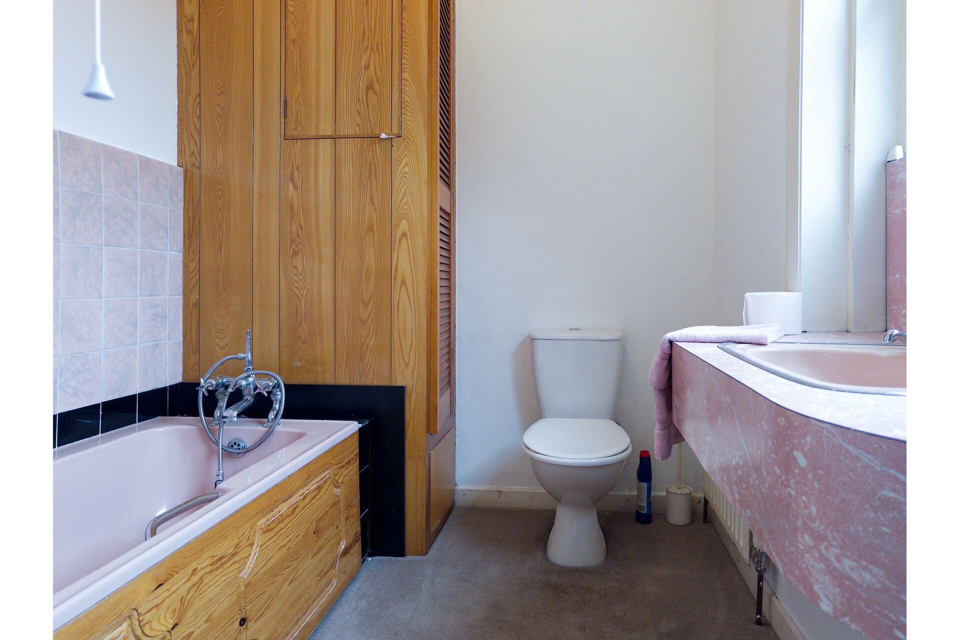Comprising of a dated pink suite to include a twin grip bath, a wash basin set into a vanity work top and a modern white close coupled toilet. A built-in linen cupboard which houses an disconnected gas water heater. Single glazed window.