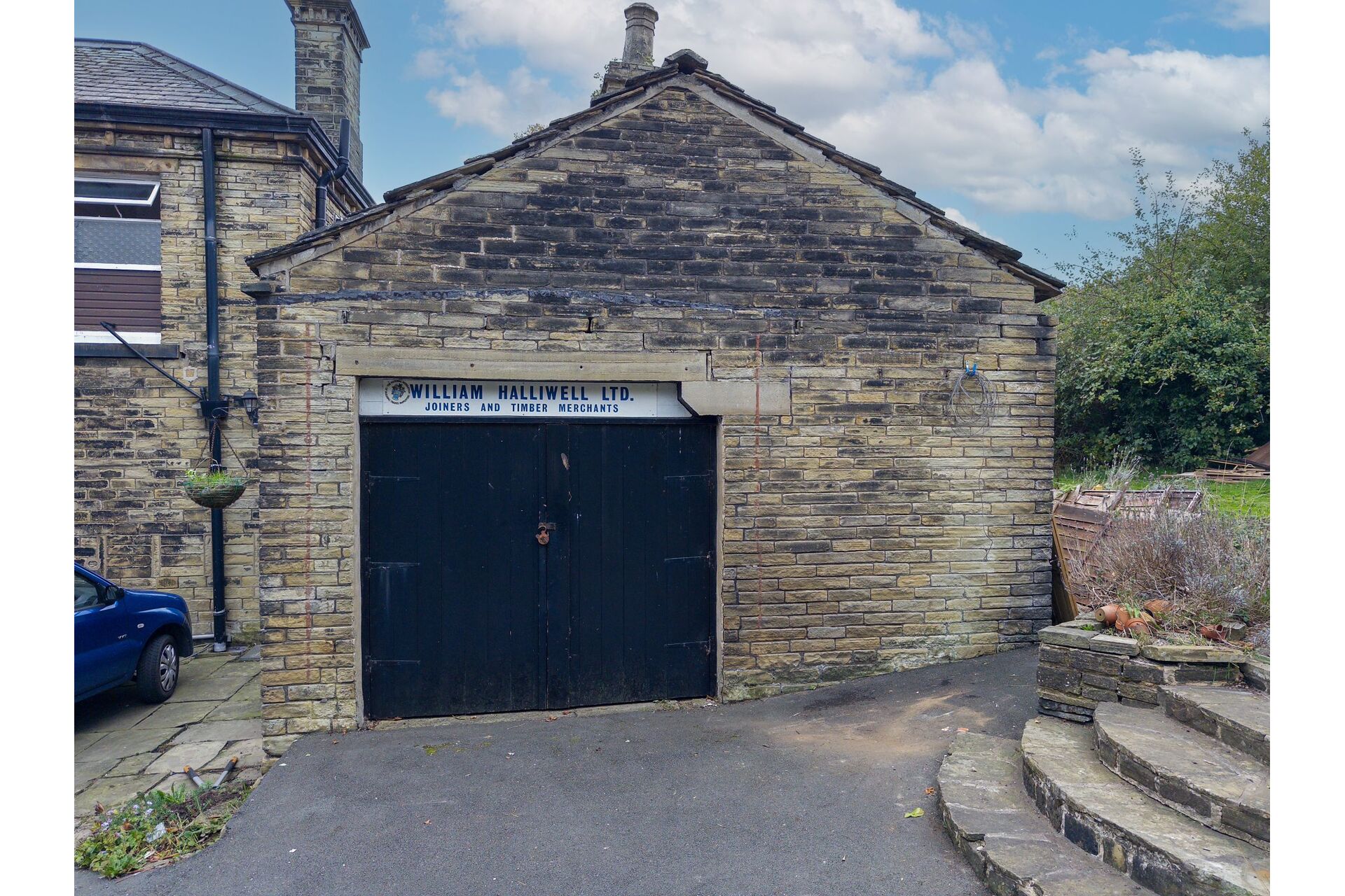 Access via two outward swinging double doors into the old coach house with a single glazed window and two boarded up windows along with a side wooden door. A pitched Yorkshire stone roof.