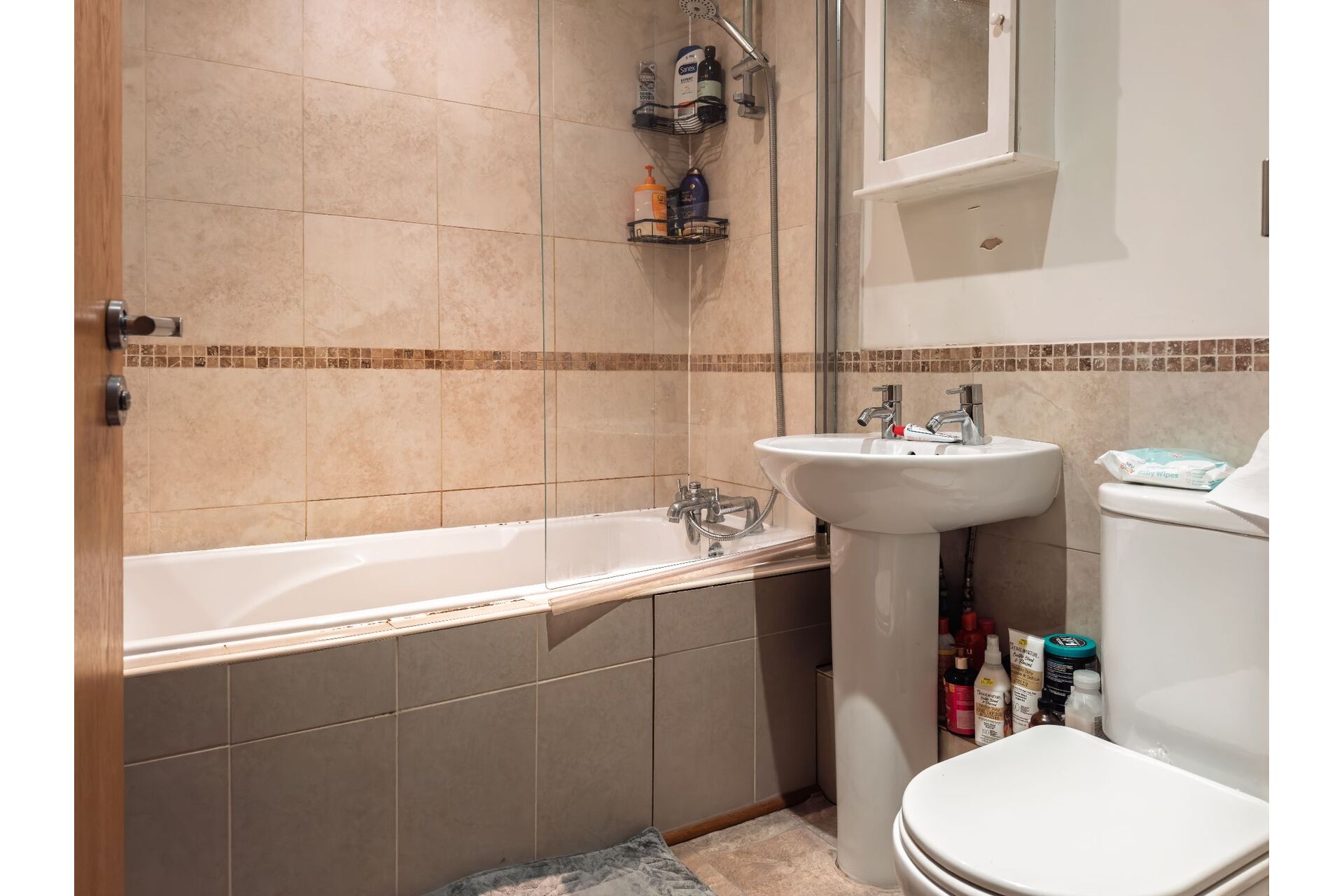 Fully tiled and fitted with a three piece bathroom suite. A mixer tap shower is over the bath.