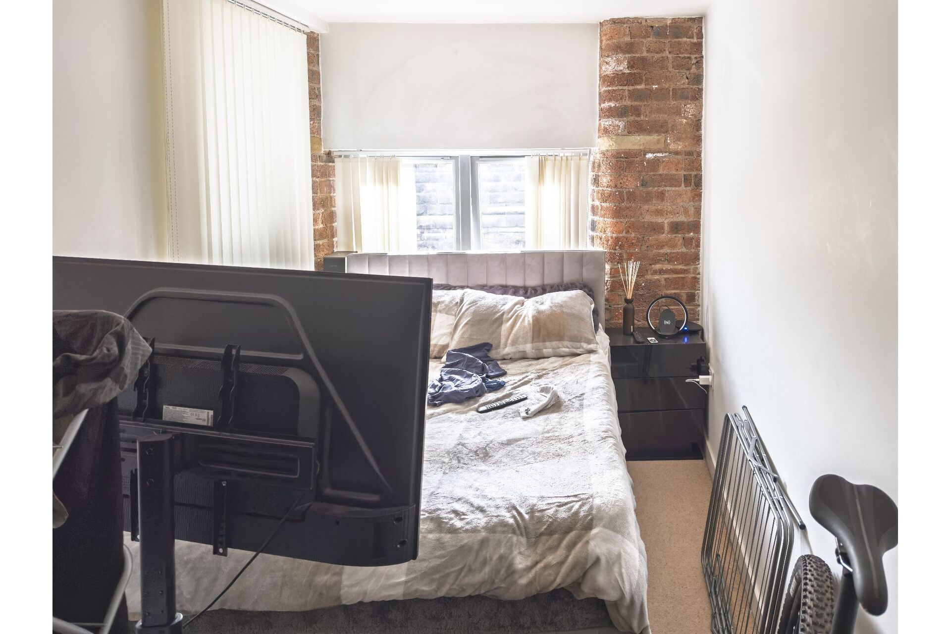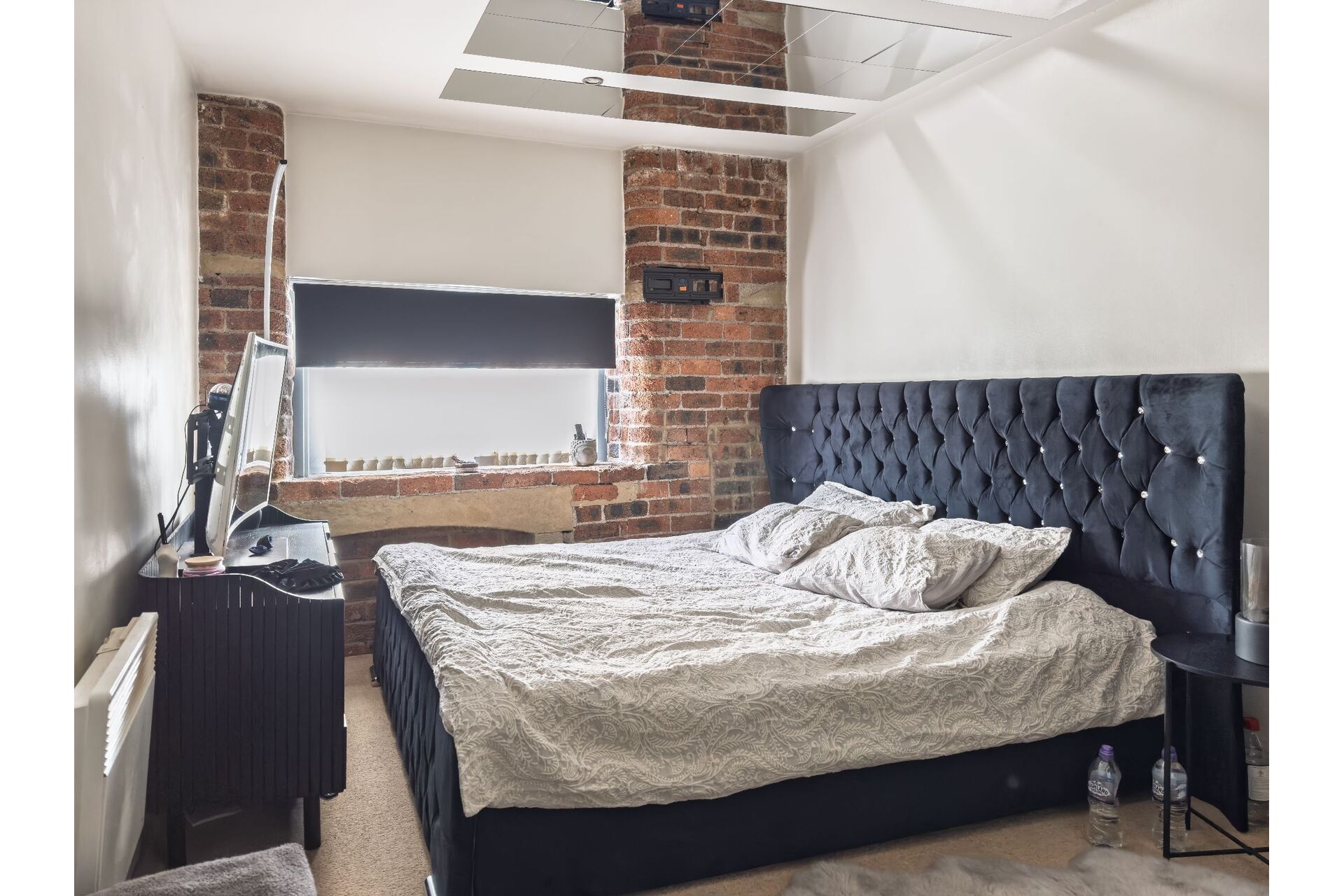 Exposed feature brick wall with a double glazed window. Built-in wardrobe.