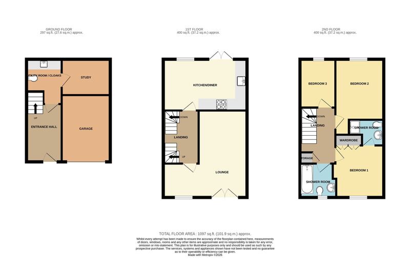 Incorporating a three-piece suite to include a shower cubicle with a glass door, pedestal wash basin and a close coupled toilet. Tiling to the splash areas.