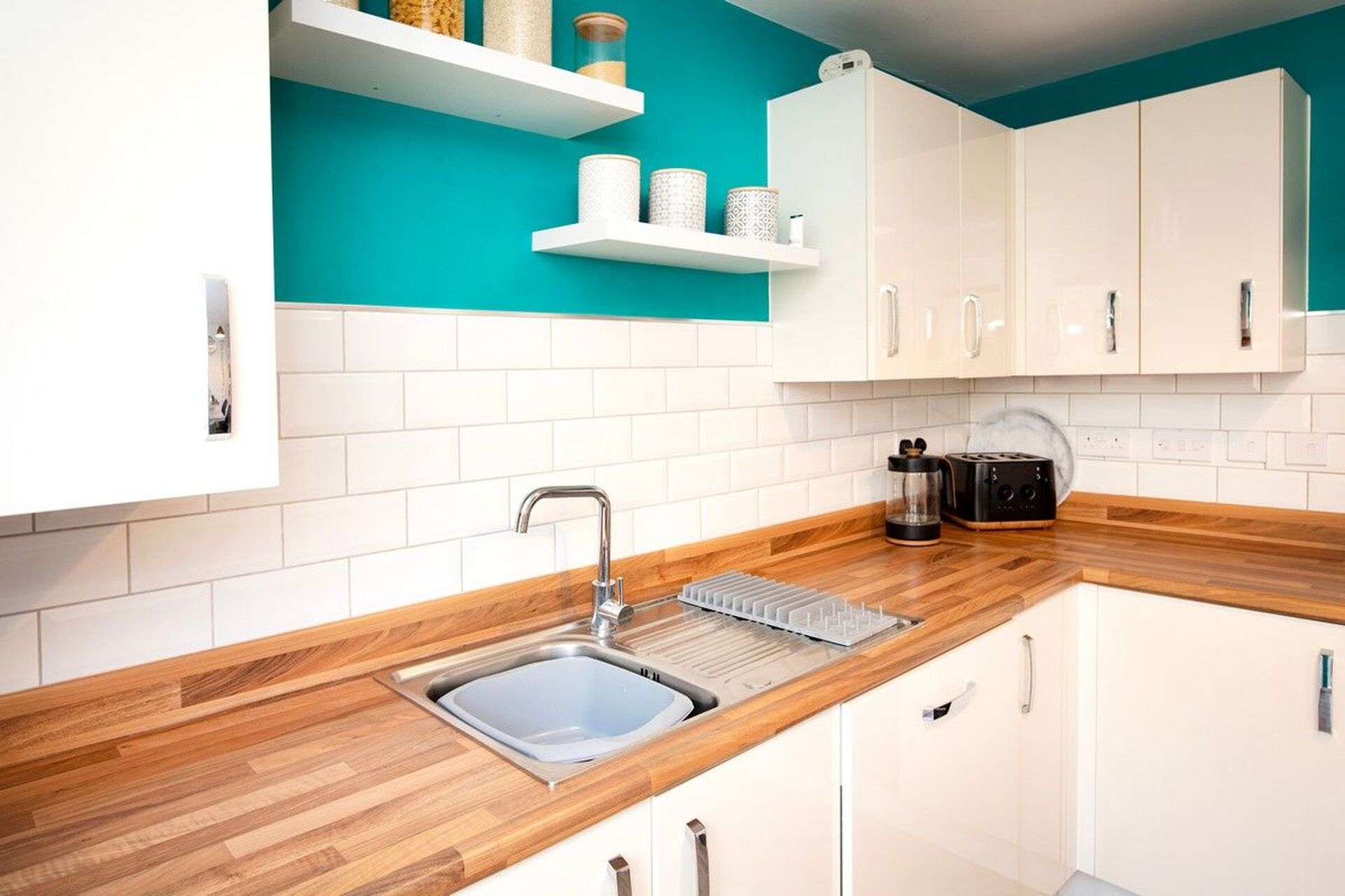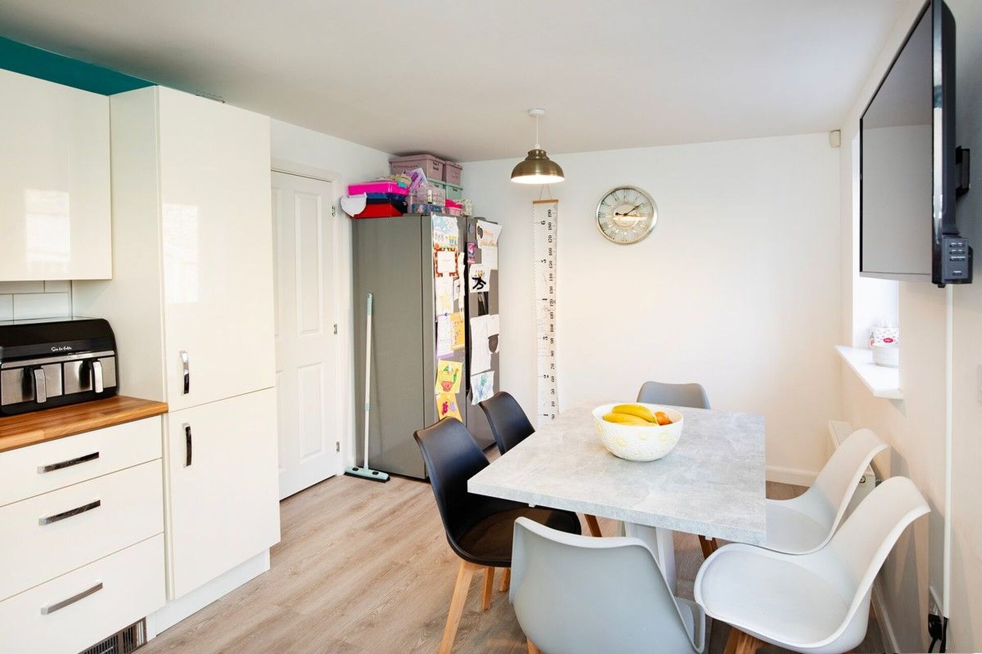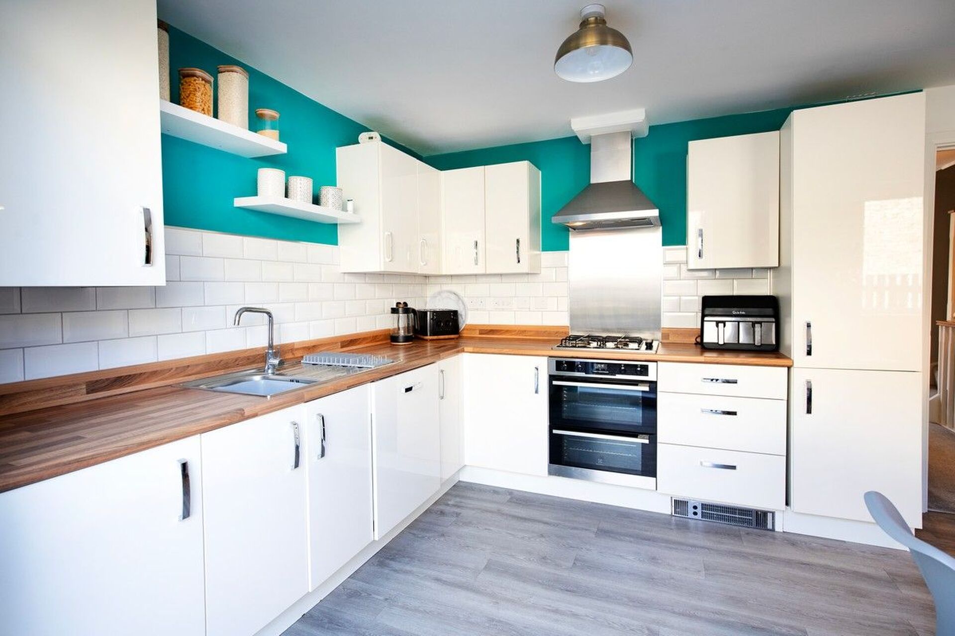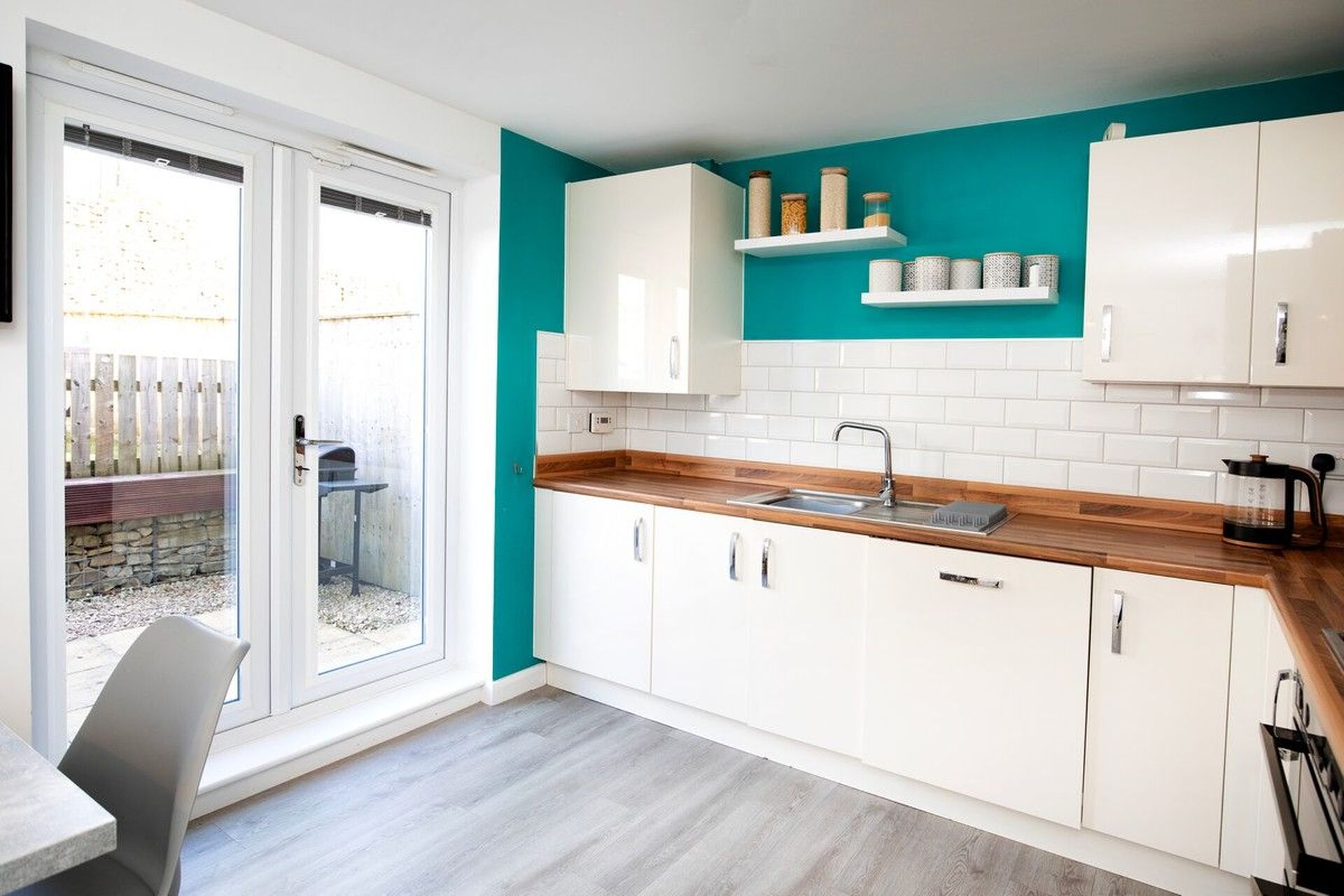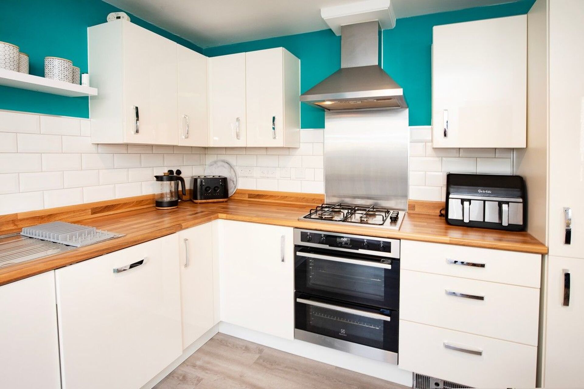 A spectacular dining kitchen boasting an array of wall and base cabinets with a complimentary wood effect worktops and tiling to the uprights. Built-in appliances include a double electric oven with a gas hob and an extractor over. There is an integral dishwasher along with a wall cabinet that houses the boiler. French doors provide access to the rear patio seating area. The dining area has a double-glazed window.