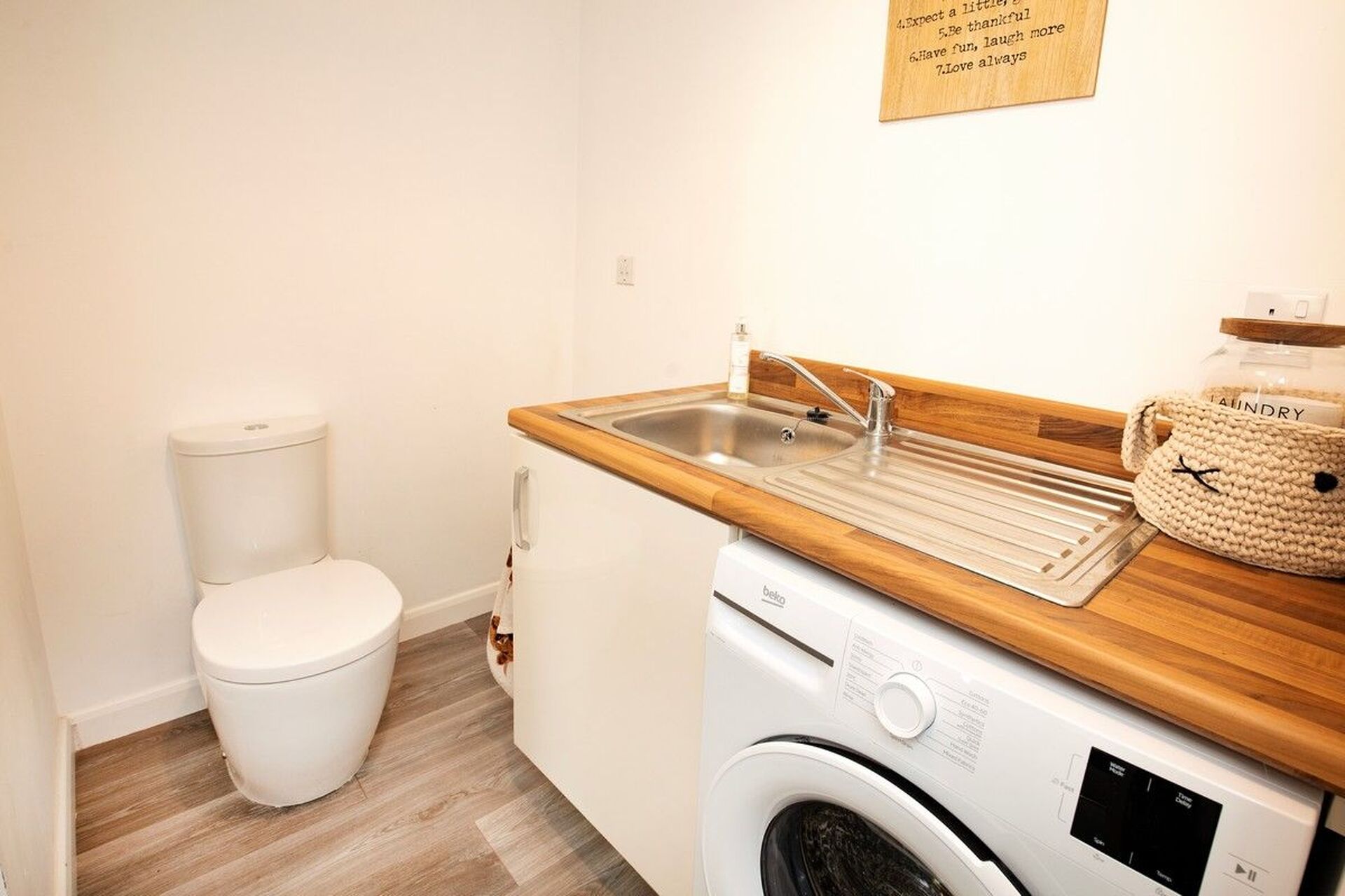 Containing a fitted work top with a stainless-steel sink unit, plumbing for a washing machine. There is a close coupled toilet.