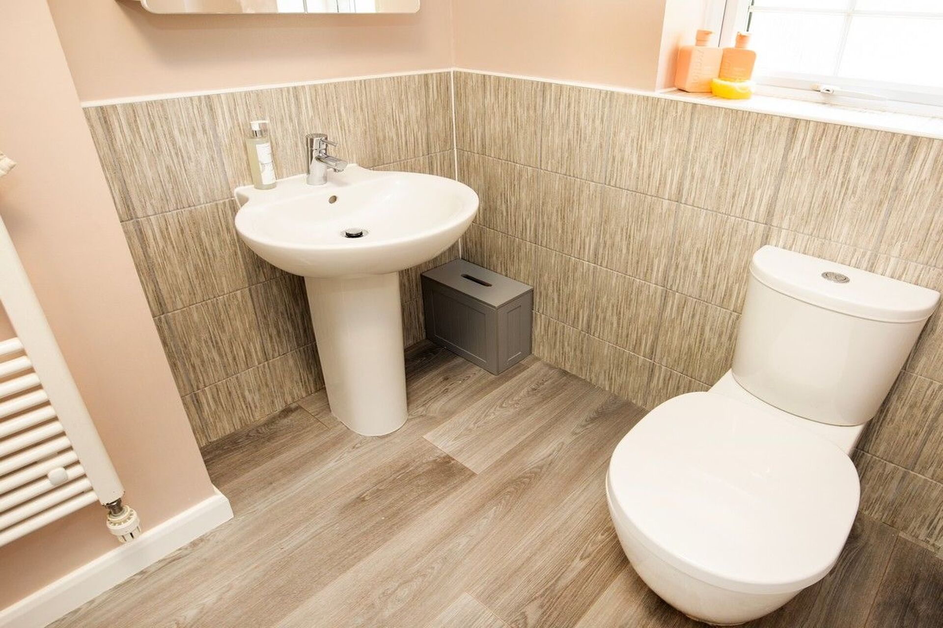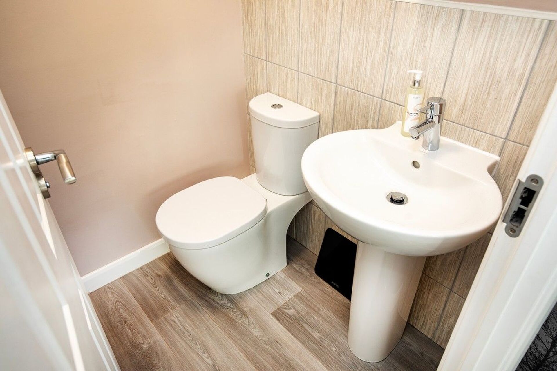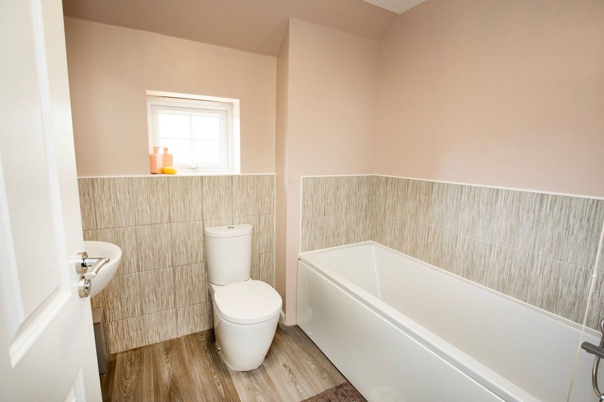 Comprising of a three-piece suite to include a panelled bath, pedestal wash basin and a close coupled toilet. Half tiling to the walls, a heated towel radiator and a double-glazed window.