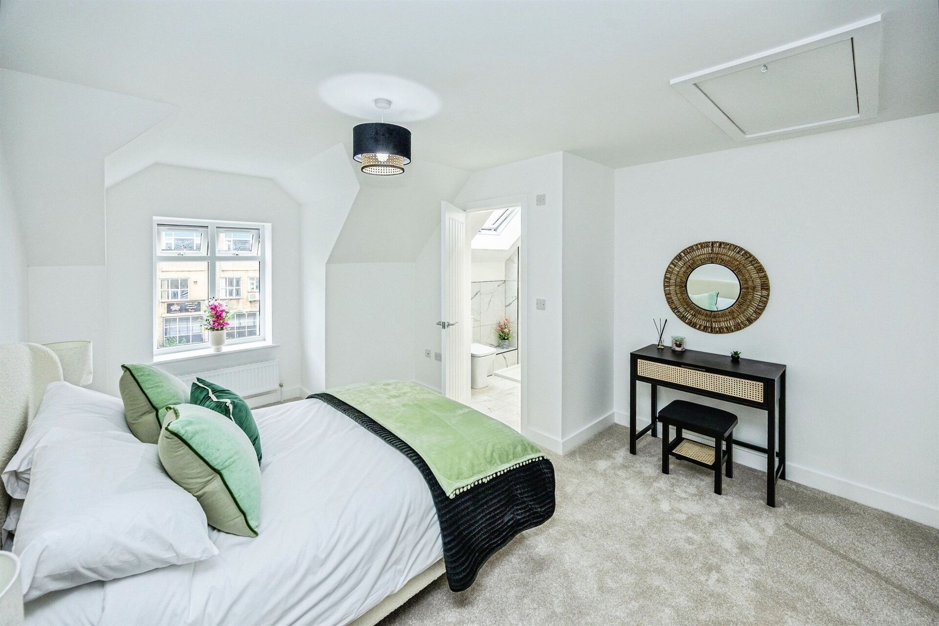 The en-suite shower room is again complimented by part tiled walls in marble effect tiles. A walk-in shower tray with glass screens and a twin head thermostatic bar shower over. Vanity unit as standard with a white wash basin and a close coupled toilet. Chrome taps & fittings along with a chrome heated Towel Radiator. Velux window.